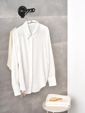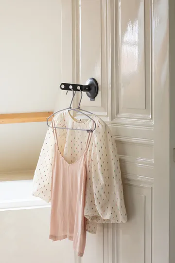 흡입 컵이 있는 브라반티아 행거를 사용하면 최대 3개의 옷걸이와 최대 2kg 무게의 옷을 걸 수 있습니다. 창문, 문 또는 타일에 쉽게 부착하여 옷을 통풍시키거나 말릴 수 있습니다. 블라우스와 다른 의류에 모두 유용합니다.