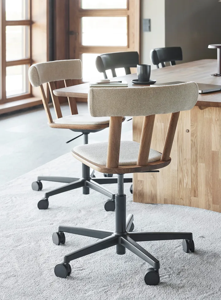 Stolab의 알트 체어 스위블 베이스 업홀스터드 시트 오크는 Form Us With Love가 디자인한 혁신적인 핀 의자의 변형입니다. 이 의자는 견고한 오크 목재와 업홀스터드 디테일을 결합하고, 바퀴가 있는 스위블 베이스를 가지고 있어 홈 오피스에 이상적입니다. 의자는 조절 가능한 높이와 기울기 기능을 가지고 있으며, 넉넉한 업홀스터드 시트로 높은 편안함을 제공합니다.