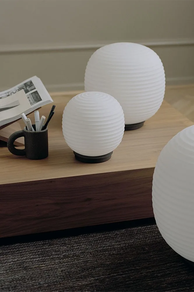 낮고 높은 조명이 함께 어우러지는 인테리어도 한 가지의 아이디어가 될 수 있습니다. 뉴웍스의 랜턴 글로브 콜렉션은 입으로 불어 만든 유리로 제작된 은은한 램프입니다.